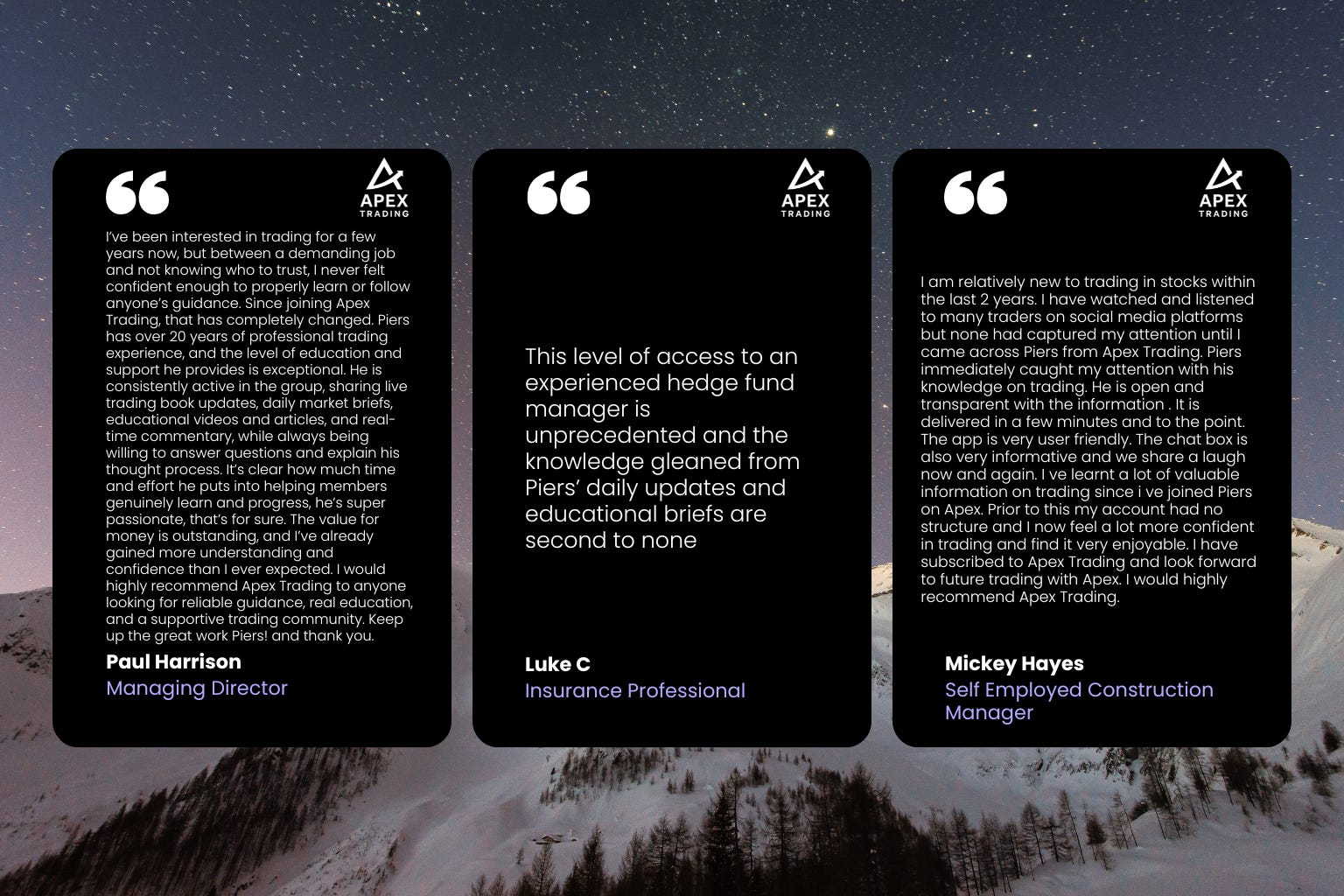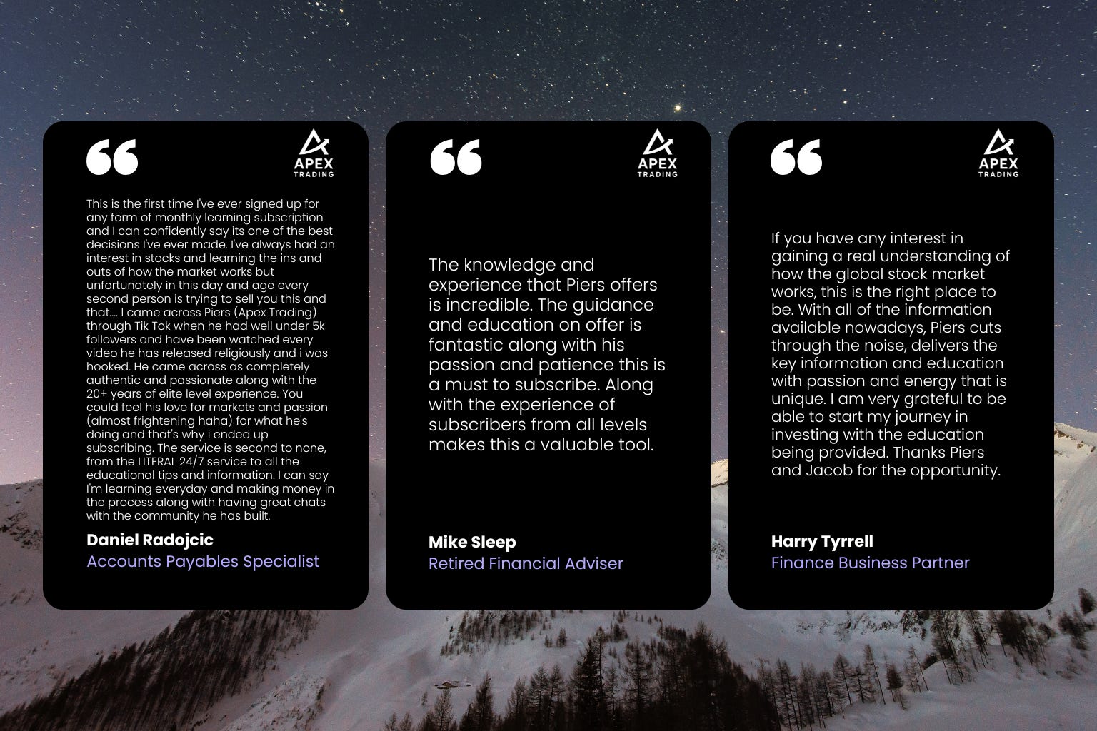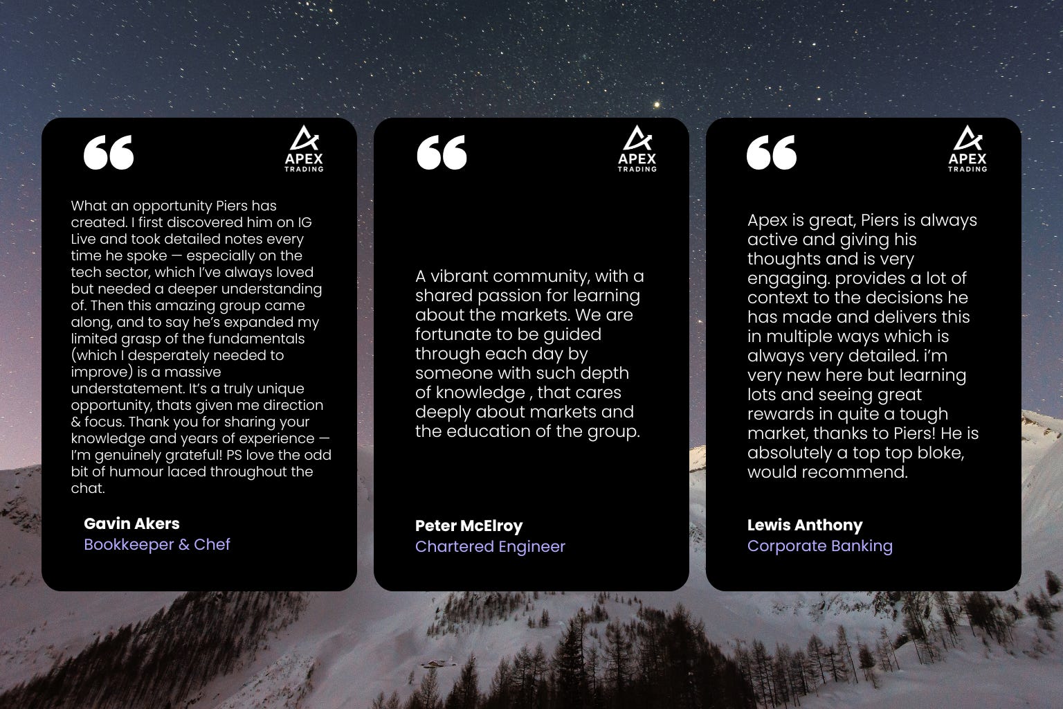 Welcome to Apex Trading testimonials page; a live, growing snapshot of what members say about learning, trading and building discipline inside this community.