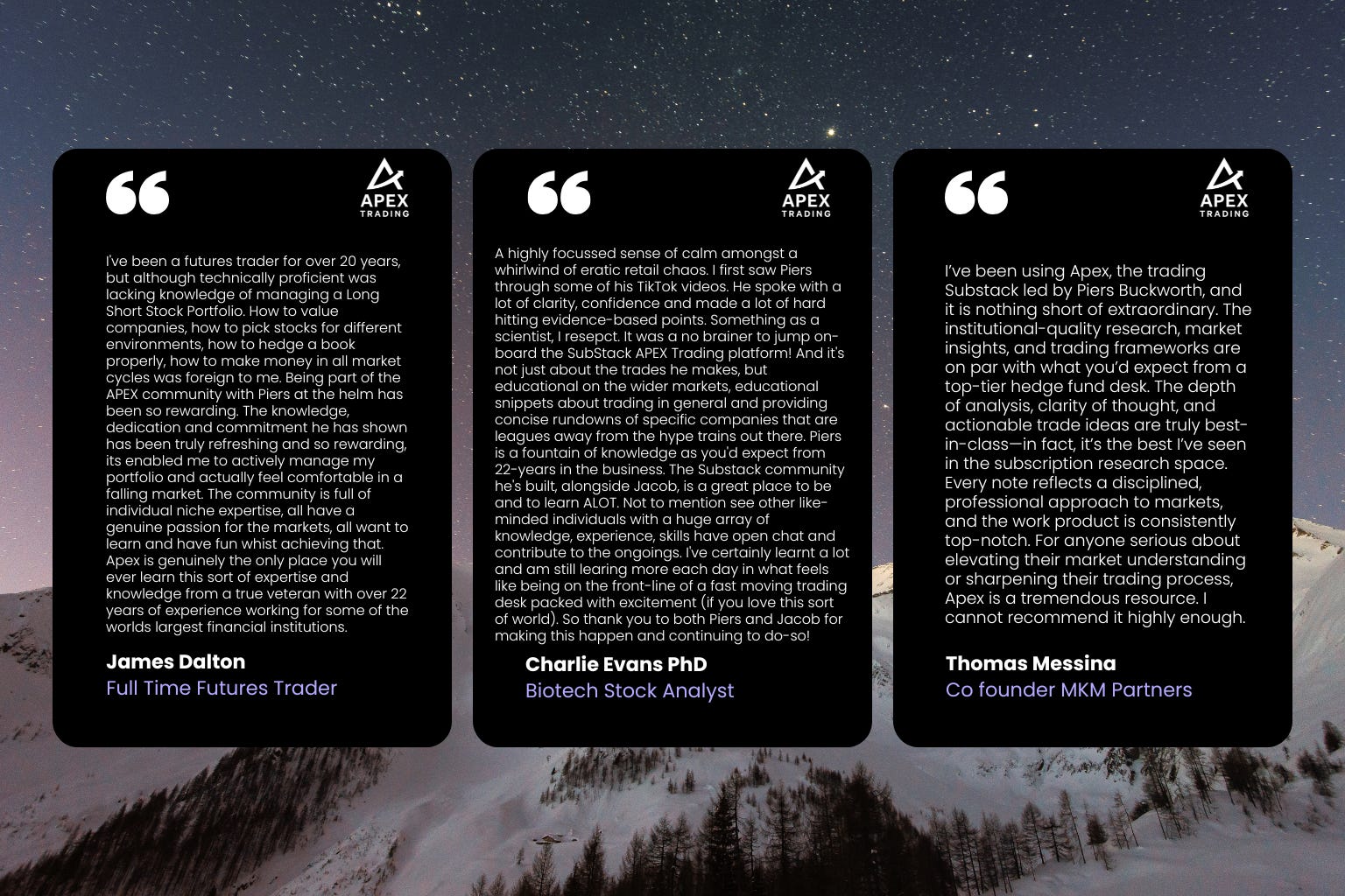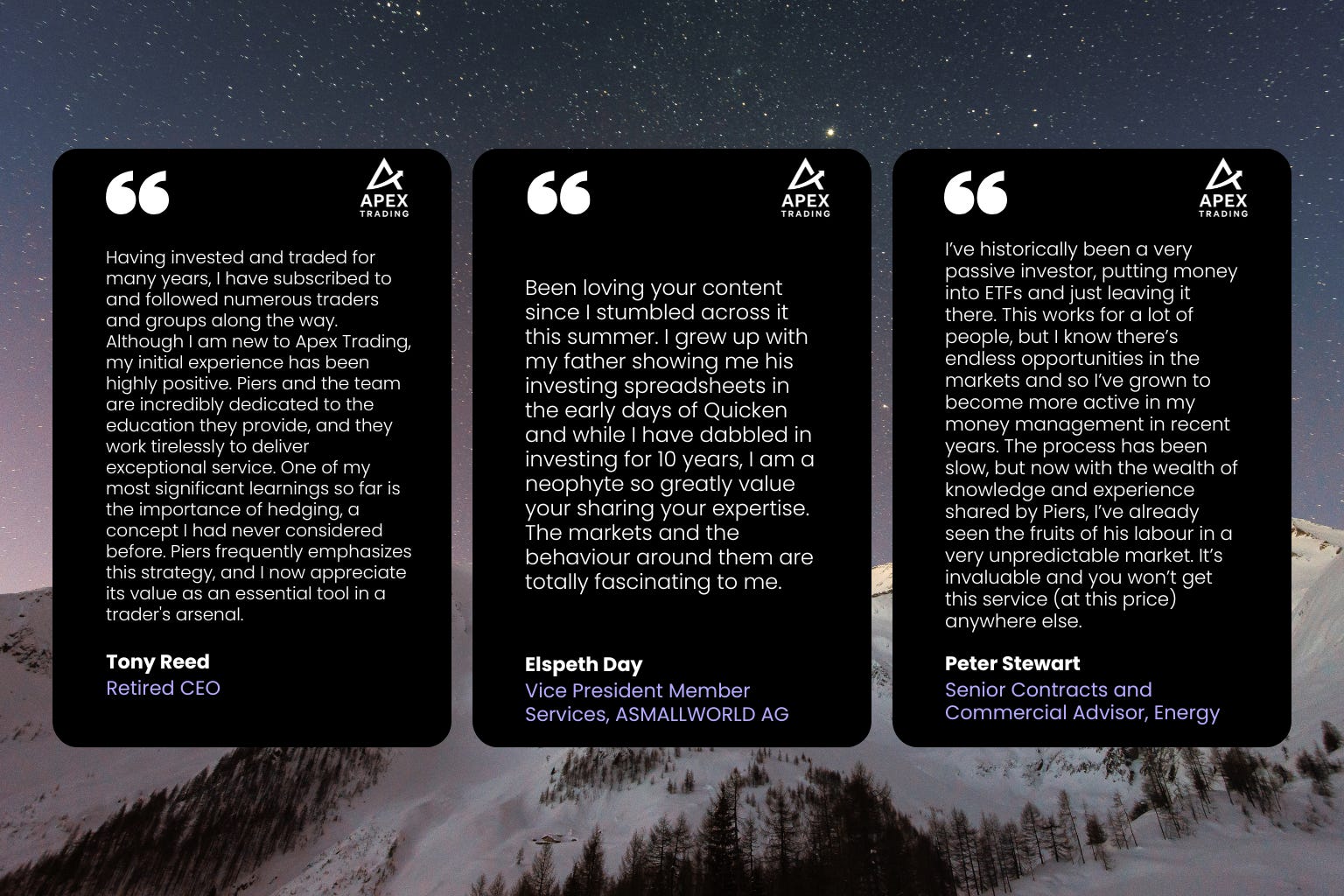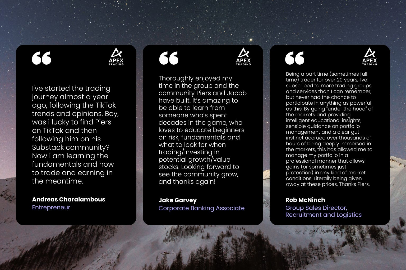 Welcome to Apex Trading testimonials page; a live, growing snapshot of what members say about learning, trading and building discipline inside this community.